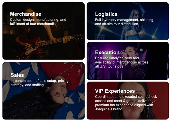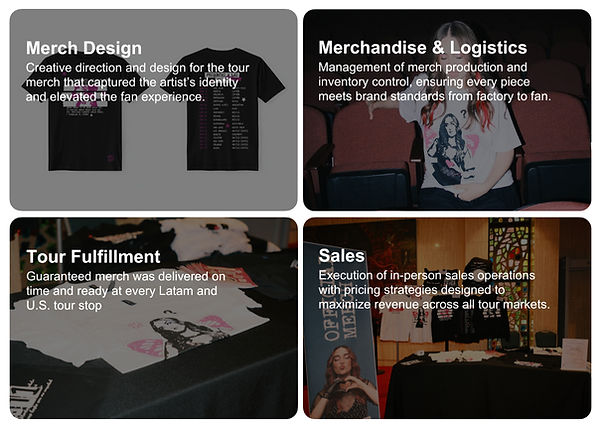 A complete merch collection developed from concept to execution, covering design,production, logistics, and sales, ensuring a cohesive brand experience that brought the artist and her fans closer together.